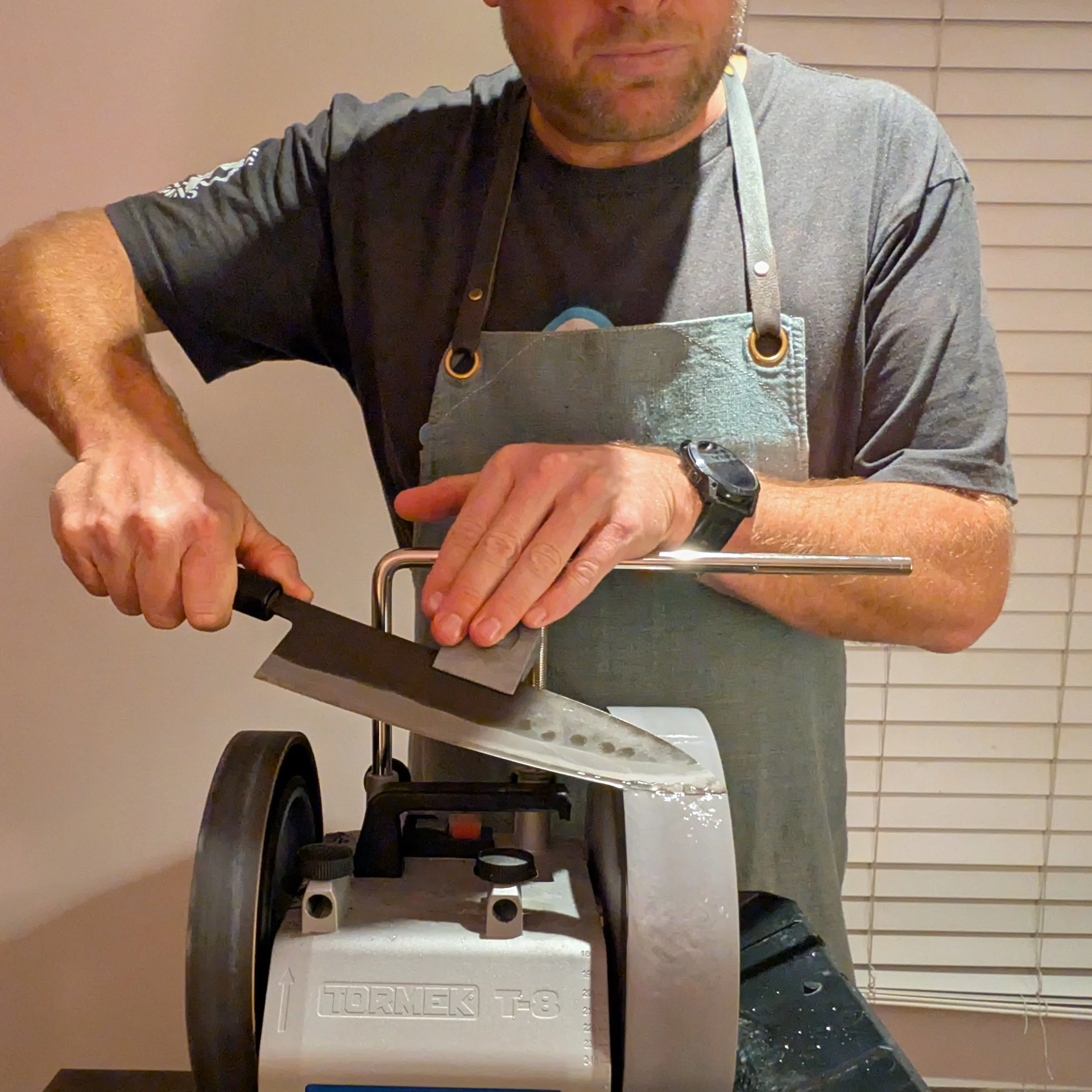 I use a Swedish-made Tormek T-8 water-cooled sharpening system. This professional-grade machine operates a stone wheel at slow speed in water. This keeps the steel cool and preserves the temper of your edge. I use a range of specialised jigs to lock in exact bevel angles for a consistent, symmetrical edge.